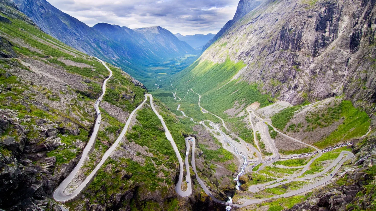 The experience of driving this road is about more than adrenaline — it is also about immersion in Norway’s natural beauty. Waterfalls cascade down nearby cliffs, glacial rivers carve through valleys below, and distant mountain peaks create a constantly changing panorama. Each curve reveals a new perspective, making the journey feel like a continuous discovery. During summer months, lush greenery softens the rugged terrain, while autumn brings fiery colors that transform the mountains into a painter’s dream. Even winter, when accessible, offers a magical scene of snow-covered landscapes that feel almost otherworldly.