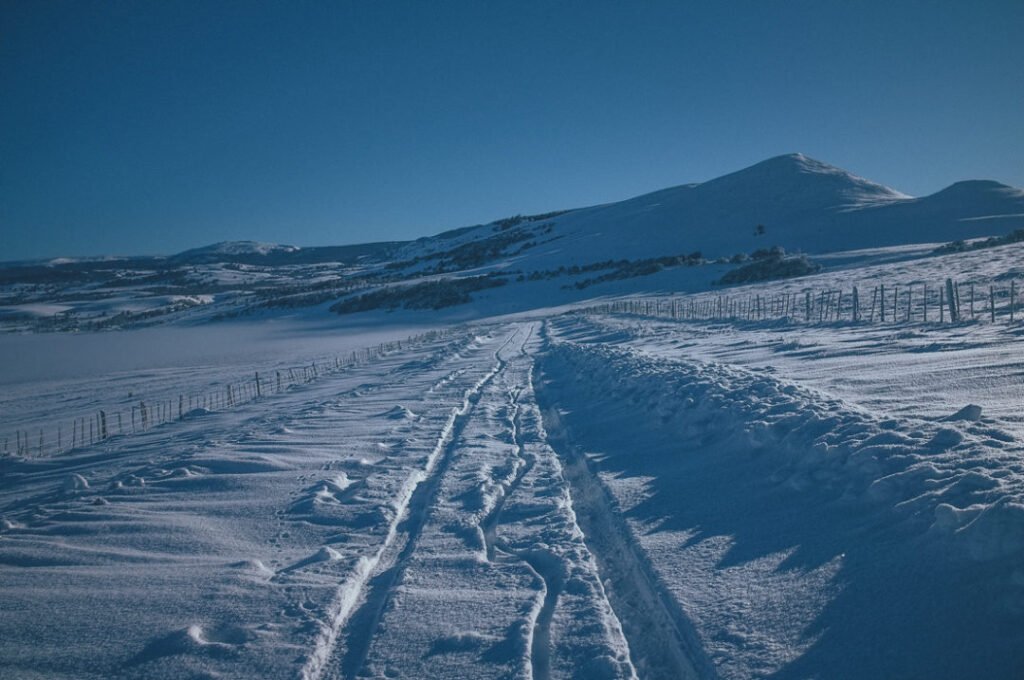 The road itself often appears narrow, gently carved into the mountainside. Snow softens its edges, blurring the boundary between asphalt and landscape. Tire tracks are few, sometimes disappearing entirely after a fresh snowfall. This absence of traffic creates an atmosphere of calm, where each turn feels personal, as if the road exists only for you.